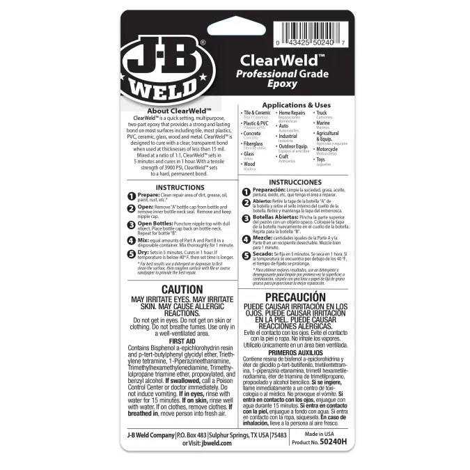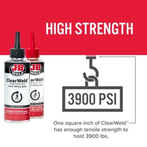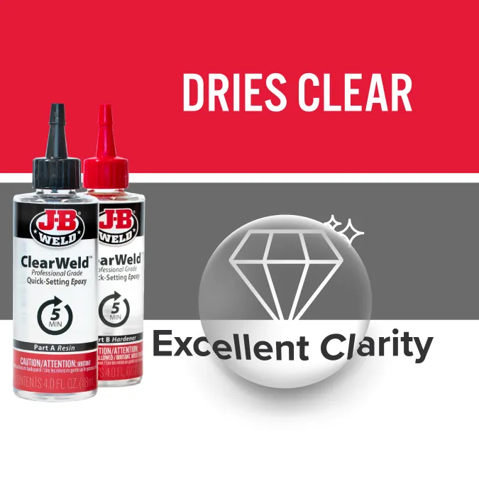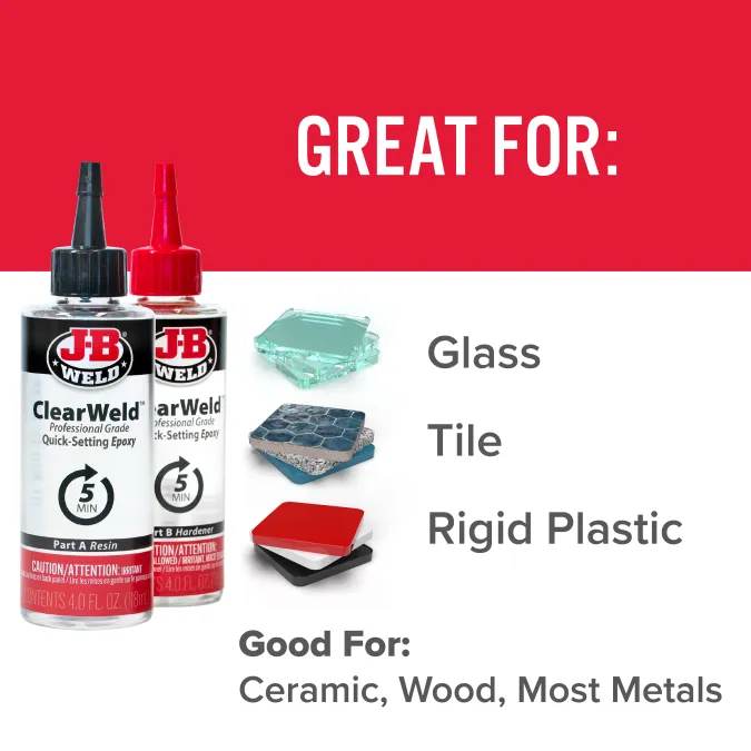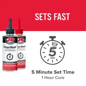 ClearWeld™ Professional Size is professional size of our quick setting, multipurpose two part epoxy that provides a strong and lasting bond on most surfaces including tile, most plastics, ceramic, glass, wood and metal. ClearWeld™ is designed to cure with a clear, transparent bond when used at thicknesses of less than 15 mil. ClearWeld™ has a 1:1 mixing ratio, sets in 5 minutes and cures in 1 hour. With a tensile strength of 3900 PSI, ClearWeld™ sets to a hard, permanent bond.