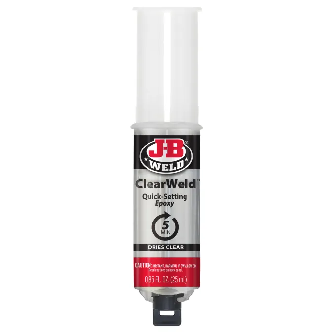 ClearWeld™ is a quick setting, multipurpose two part epoxy that provides a strong and lasting bond on most surfaces including tile, most plastics, ceramic, glass, wood and metal. ClearWeld™ is designed to cure with a clear, transparent bond when used at thicknesses of less than 15 mil. ClearWeld™ has a 1:1 mixing ratio, sets in 5 minutes and cures in 1 hour. With a tensile strength of 3900 PSI, ClearWeld™ sets to a hard, permanent bond.