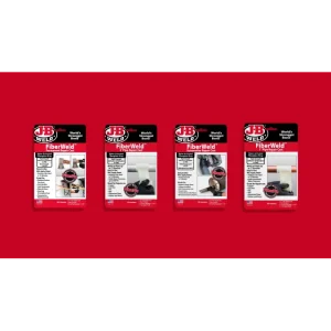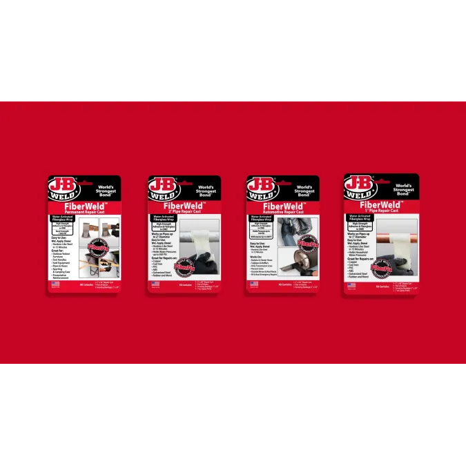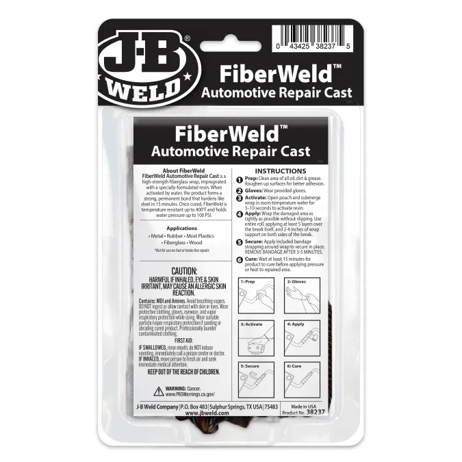 J-B Weld FiberWeld Automotive Repair Cast is a high-strength fiberglass wrap, impregnated with a specially-formulated resin. When activated by water, the product forms a strong, permanent bond that hardens like steel in 15 minutes. Once cured, FiberWeld is temperature resistant up to 400°F and holds water pressure up to 100 PSI.