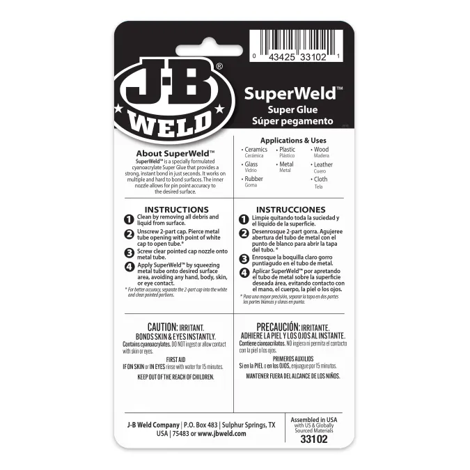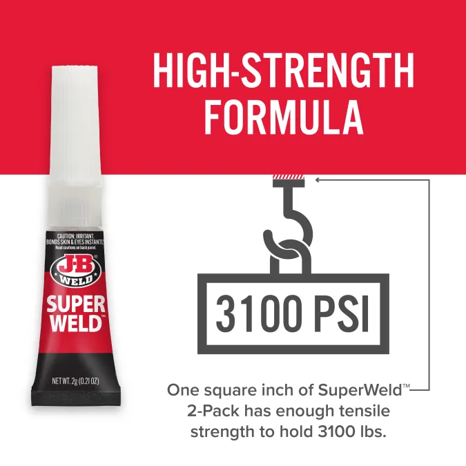 SuperWeld™ is a specially formulated cyanoacrylate Super Glue that provides a strong, instant bond in just seconds. It works on multiple and hard to bond surfaces.