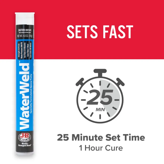 WaterWeld will plug or seal leaks and patch holes and cracks in almost anything. Ideal for repairing plumbing, fuel tanks, tub and shower, drains, pool and spa, boats and potable water tanks; setup occurs even under water. After curing, it can be drilled, tapped, filed, sanded and painted. WaterWeld has a set time of 15-25 minutes and sets hard in one hour. WaterWeld cures to an off-white color, is rated at a strength of 4370 PSI and will withstand water pressure up to 500 PSI and temperatures up to 250°F.